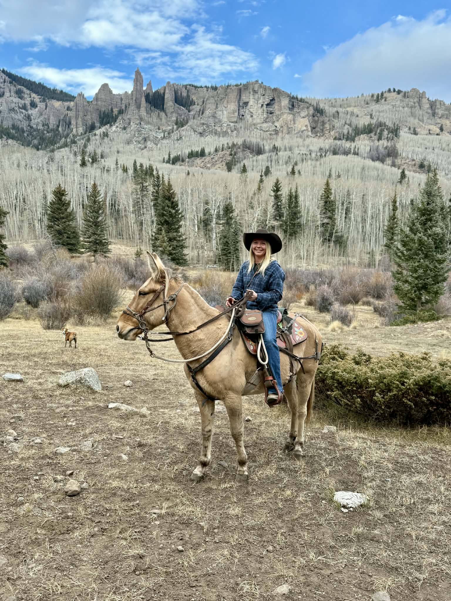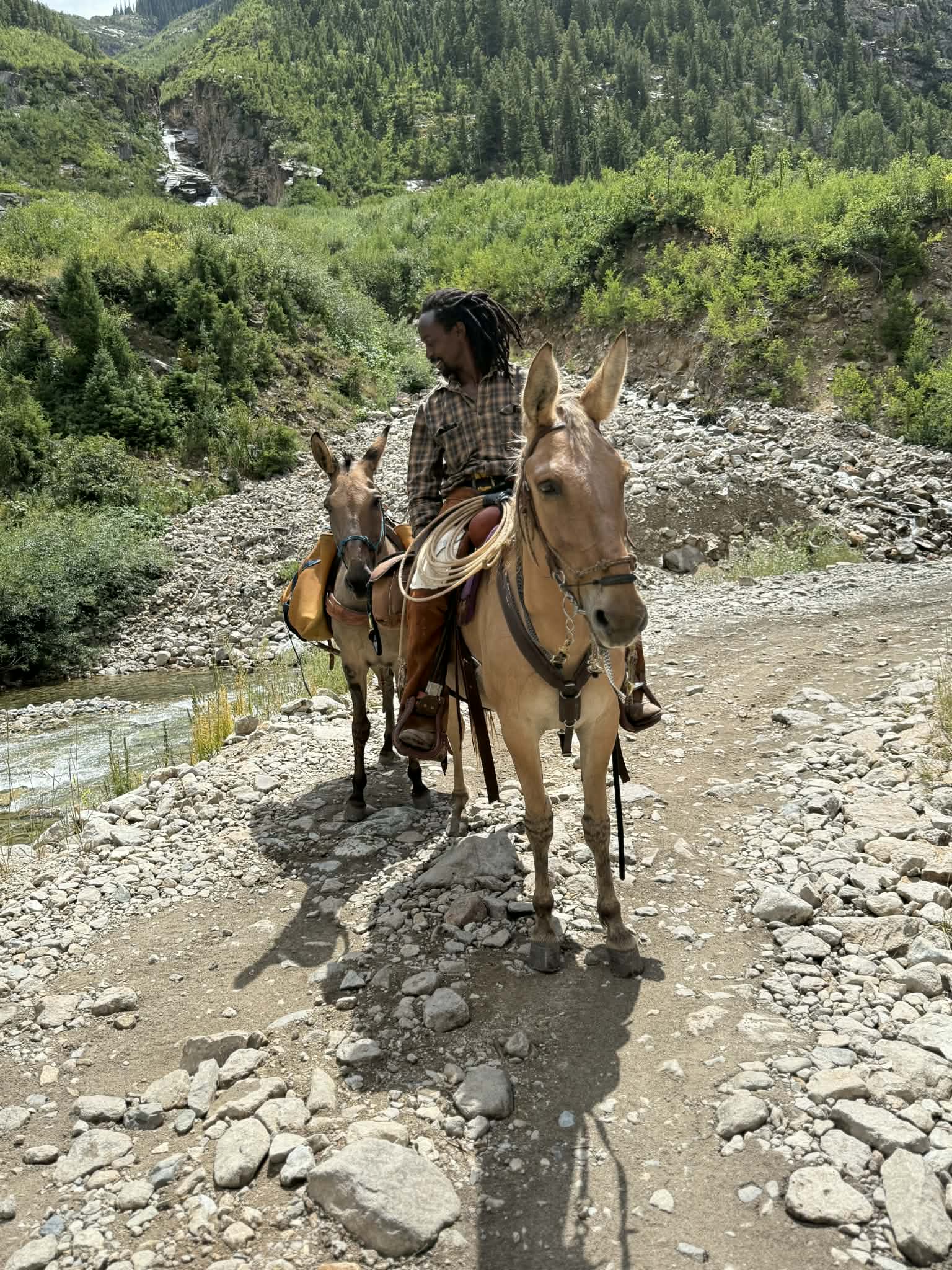 Titus is a 9-year-old 15.1hh stunning dun John mule. We adore his affectionate, calm, and comical demeanor. Check out his videos at https://youtu.be/Z7YbCjnJXTc?si=vJV3siM3FcJpVX3q . Titus is so versatile! He can work cattle, work around the ranch, pack, trail-ride, and even pony a camel! He is comfortable around a menagerie of animals, heavy equipment, and anything life throws at him! He is stunningly marked, and a gorgeous color. He is surefooted, and ready to be the best adventure buddy you ever had. Titus is as healthy as a mule and we have never had the vet out for him. He will ride out alone, in a group, ride in the front, back, or middle, and be in any position in a pack string including leading it. I guarantee I could have him safely pulling a cart in a week! The only complaint I have about Titus is that he will try to dig a hole to China standing tied alone if you let him, but he will stop if you hobble him or get after him, and he has improved significantly with training. Otherwise, he is an excellent citizen and a joy to be around. He likes to plod along but he will trot or lope if you ask him and he will go for miles and miles and miles. Don’t miss out on a really special and really wonderful mule! A fantastic home is a must.